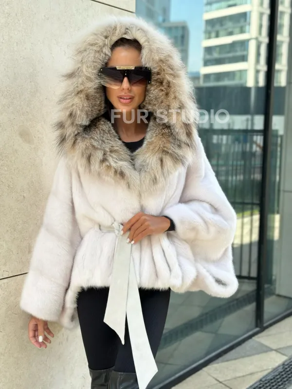 Белое норковое манто с капюшоном из меха рыси – выбор девушек, которые готовы экспериментировать. Летучка сделает ваш образ легким и воздушным. Необычный цвет напомнит о лете и освежит ваш стиль. Нежный мех бережно согреет владелицу в любые холода. Шикарный капюшон из рыси позаботится, чтобы волосы были в тепле.