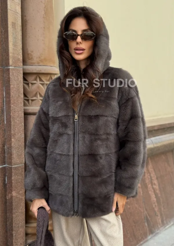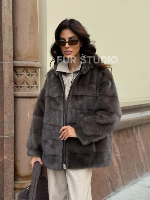 Материал выбранной модели — аукционная норка, доступна в цвете серый. Куртка предлагается в разнообразии размеров, от S до XL, а ее длина составляет 65-70 см, что выигрышно подчеркивает вашу фигуру. Этот вариант идеально подходит для тех, кто ценит роскошь и утонченность натуральных материалов.
