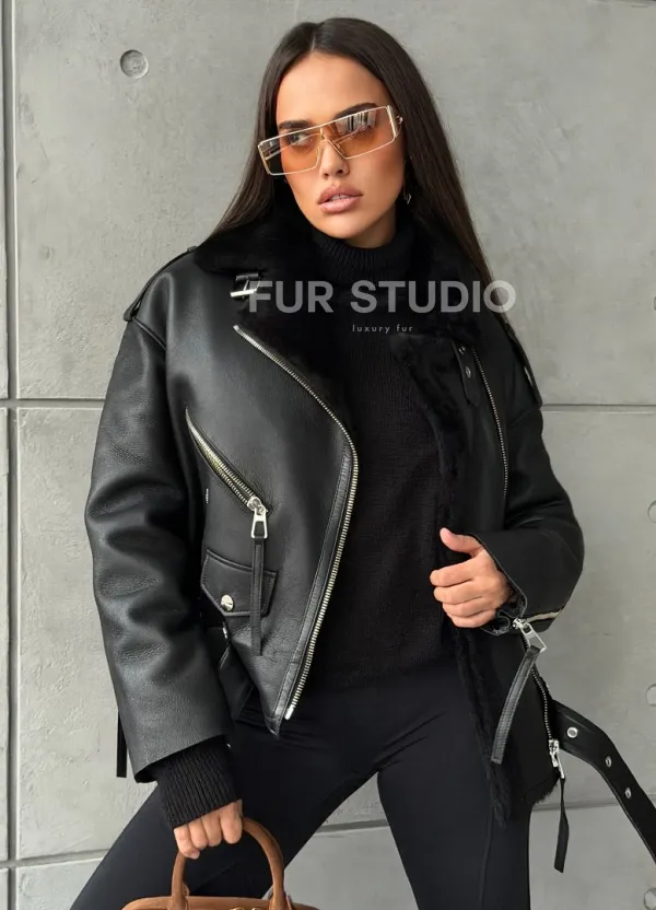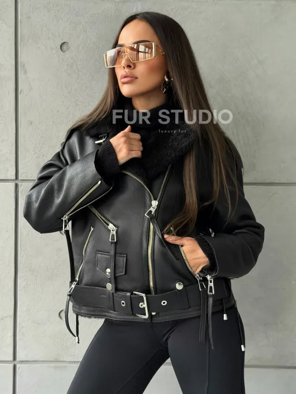 Черная короткая дубленка авиатор 102802
