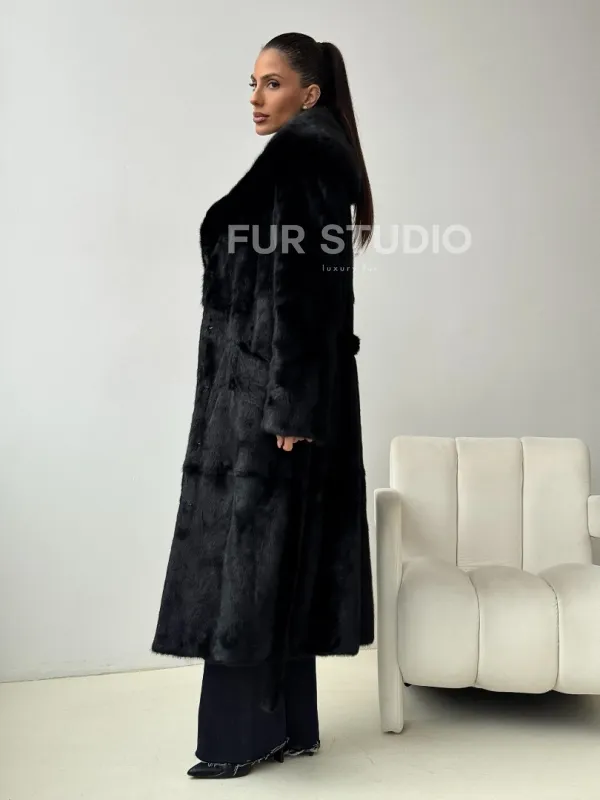 Мех данной шубы аукционная норка , цвет черный. Предлагается в размерах от 42 до 52. Длина модели 115-120 см, что выгодно подчеркивает фигуру девушек. Эта модель идеально подойдет для девушек и женщин, предпочитающих роскошные натуральные меха.