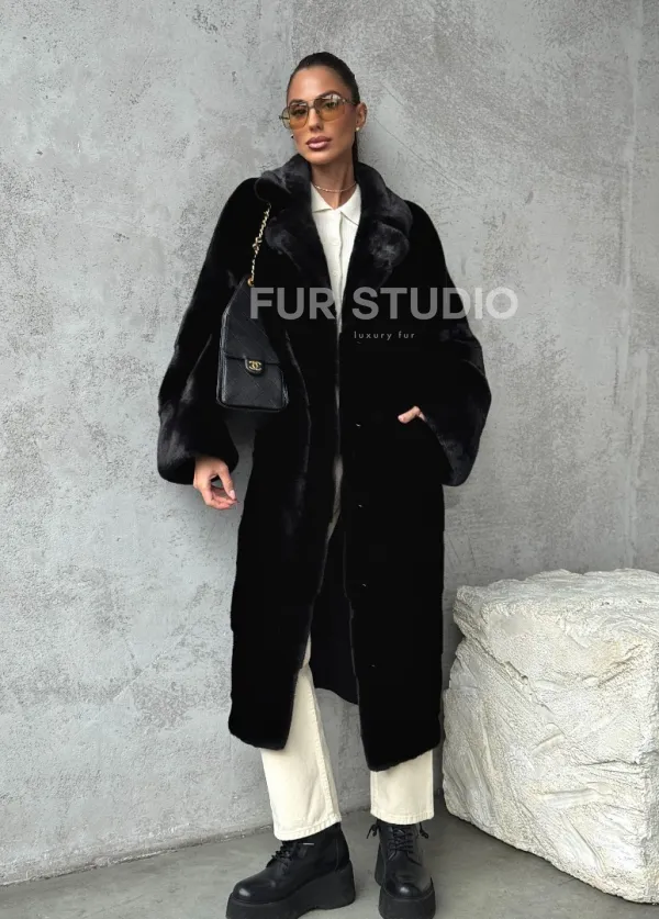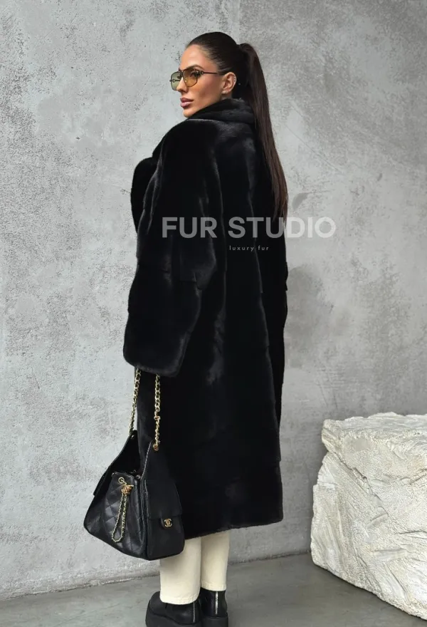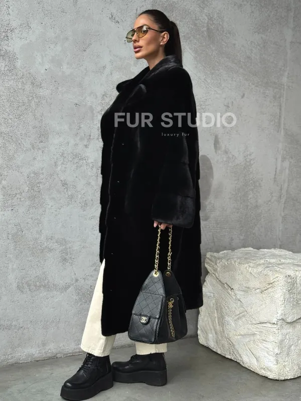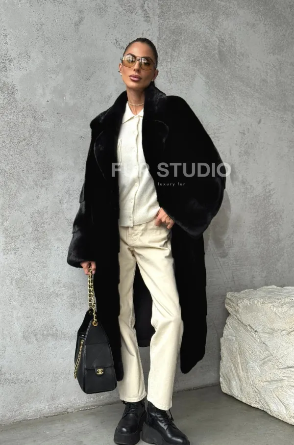 Мех данной шубы аукционная норка, цвет черный. Предлагается в размерах от 42 до 46. Длина модели 115-120 см, что выгодно подчеркивает фигуру девушек. Эта модель идеально подойдет для девушек и женщин, предпочитающих роскошные натуральные меха.