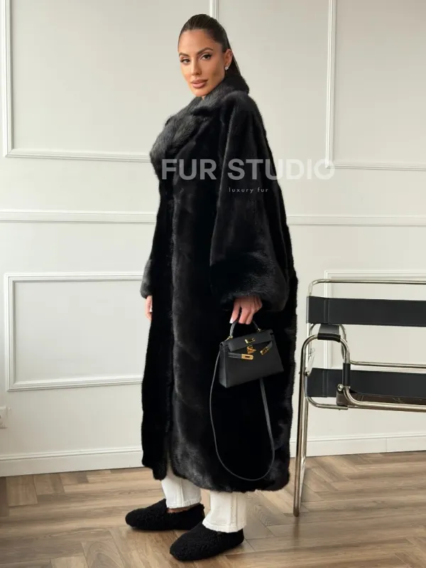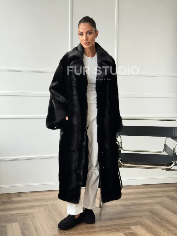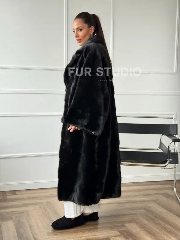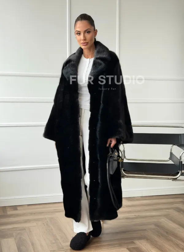 Мех данной шубы аукционная норка , цвет черный. Предлагается в размерах от 42 до 68. Длина модели 120-125 см, что выгодно подчеркивает фигуру девушек. Эта модель идеально подойдет для девушек и женщин, предпочитающих роскошные натуральные меха.