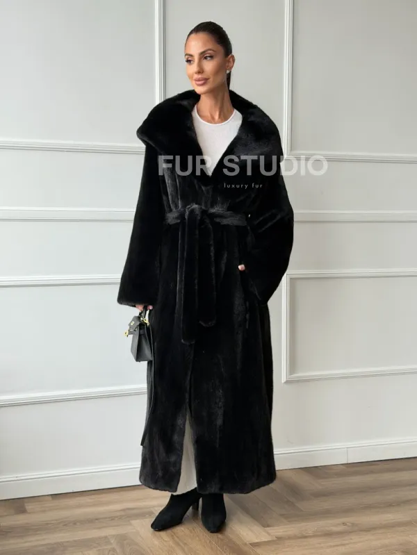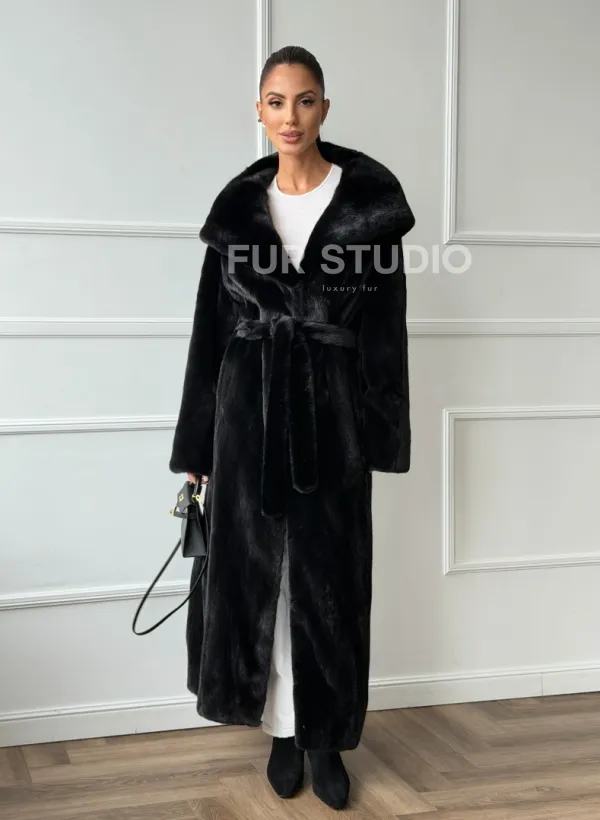 Мех данной шубы аукционная норка, цвет черный. Предлагается в размерах от 42 до 50. Длина модели 125-130 см, что выгодно подчеркивает фигуру девушек. Эта модель идеально подойдет для девушек и женщин, предпочитающих роскошные натуральные меха.
