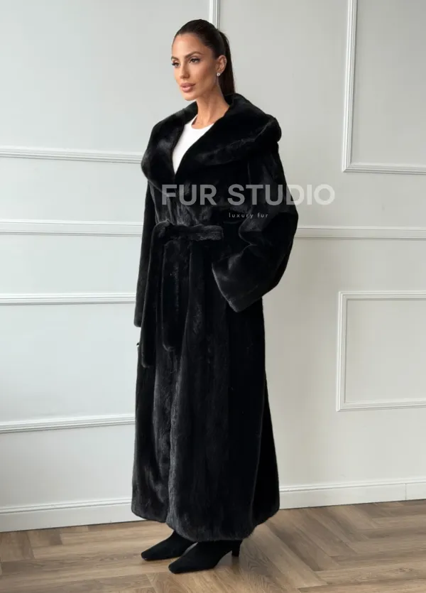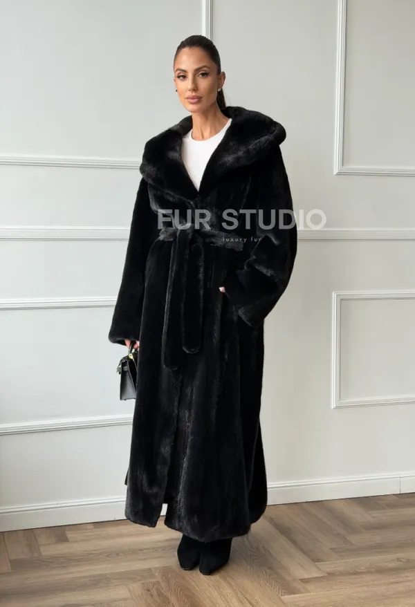 Чёрная норковая шуба модель «кимоно» с капюшоном кобра 102650