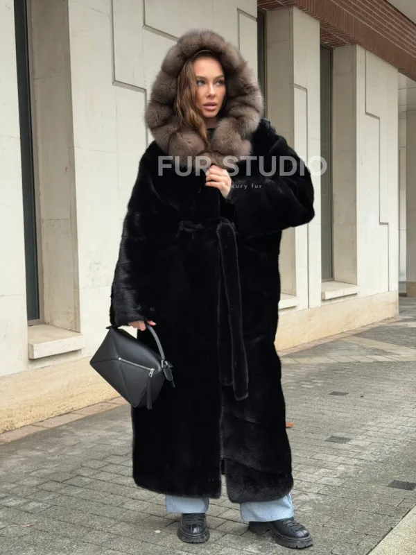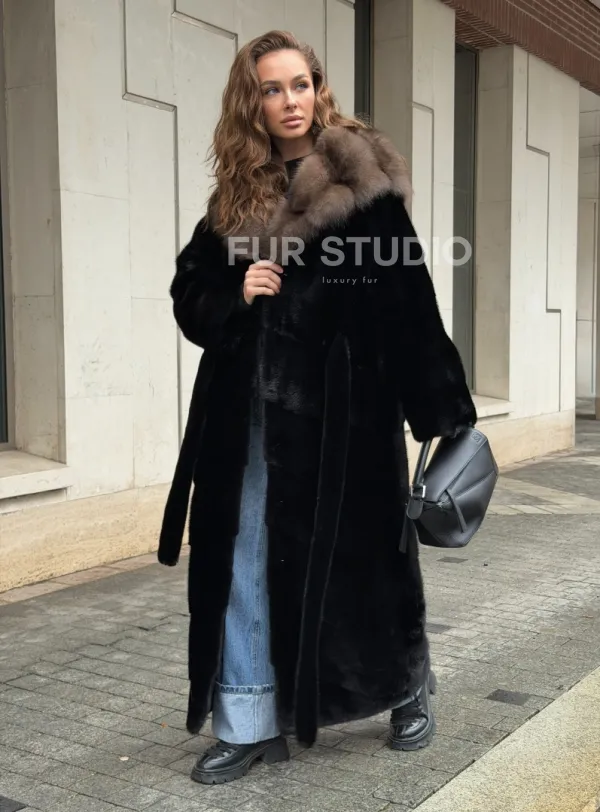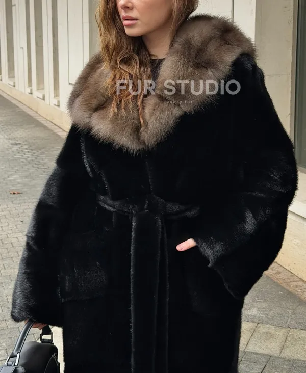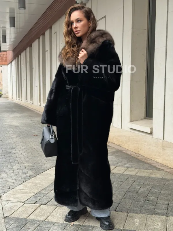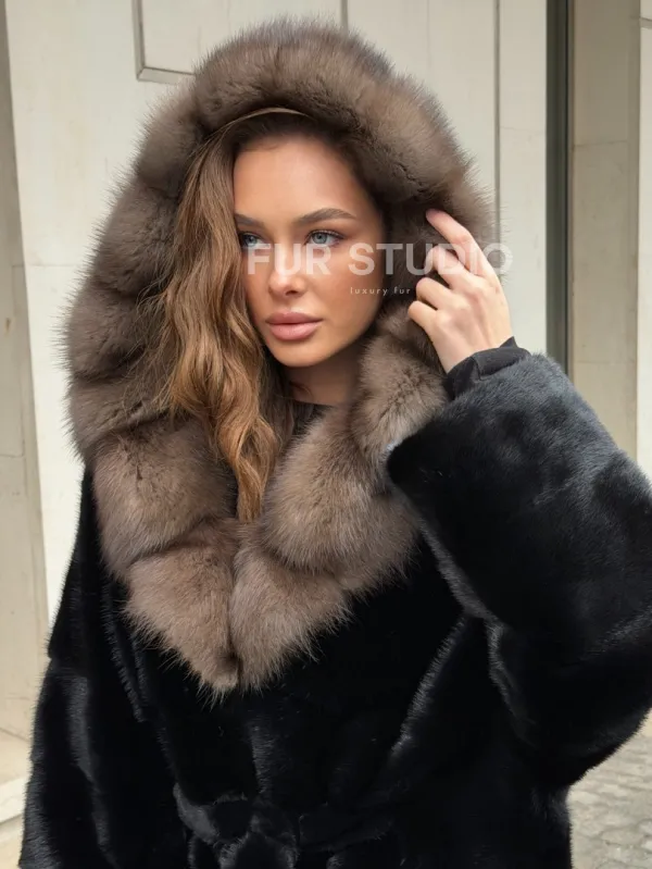 Удобные рукава не дадут замерзнуть ручкам в непогоду. Необычный пояс очертит талию и создаст силуэт “песочные часы”. Роскошные манжеты подчеркнут изящные кисти. Купить черную норковую шубу с капюшоном из меха куницы могут женщины, которые имеют безукоризненный вкус и разбираются в моде.