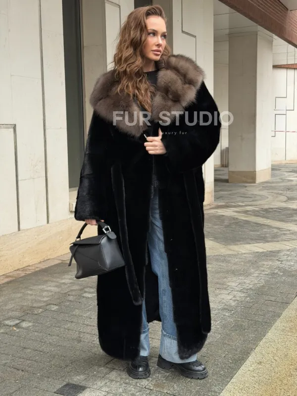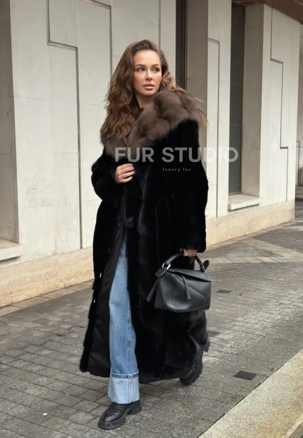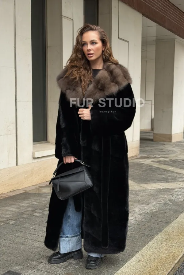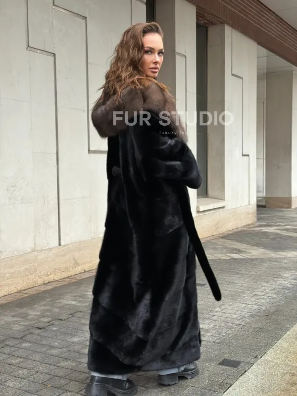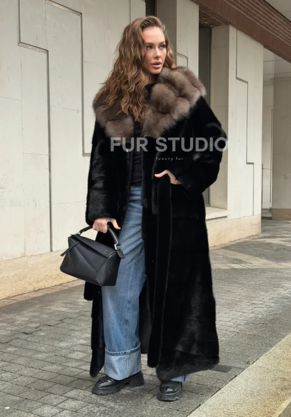 Черная норковая шуба с капюшоном из меха куницы - выбор женщин, которые хотят выглядеть стильно вне зависимости от погоды. Сочетание меха норки и куницы делают изделие неординарным. Цвет выгодно подчеркнет оттенок волос и глаз владелицы. Капюшон позаботится о прическе и не даст замерзнуть в ветреную погоду. Длина оптимальна и покрывает все участки тела. Это очень удобно для любительниц голых ножек в холодное время года.