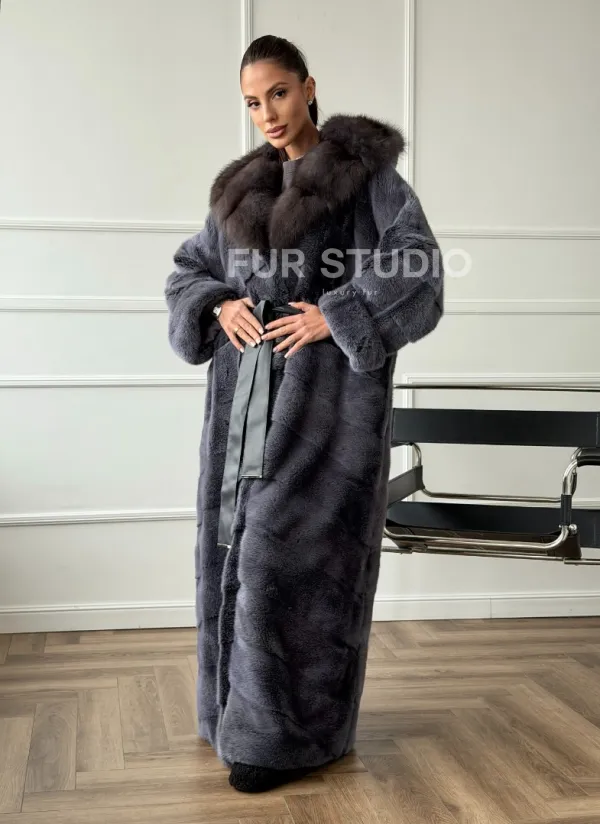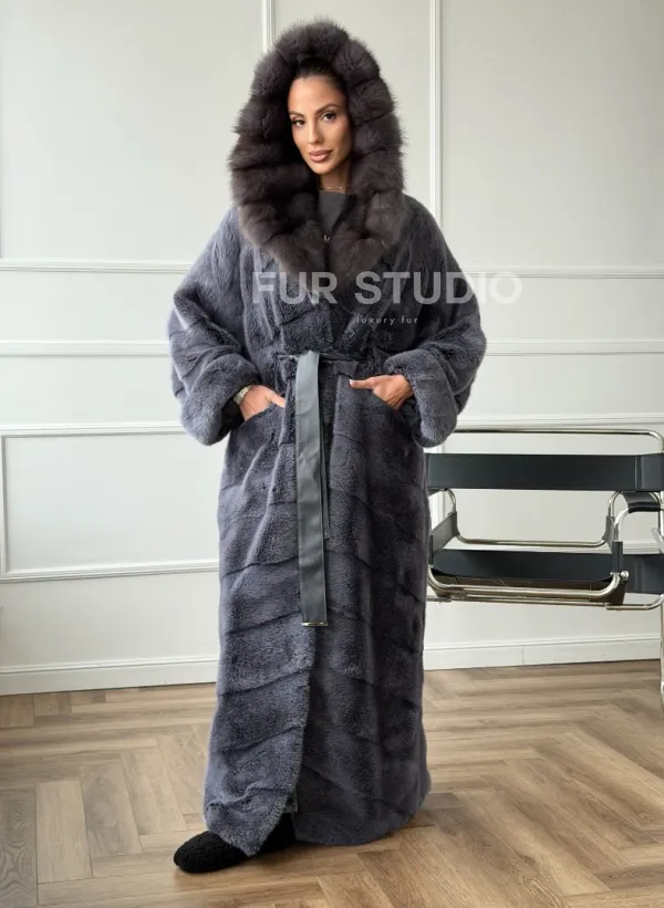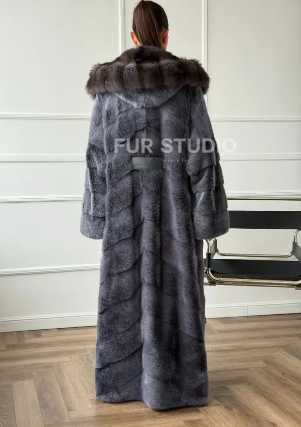 Длинная норковая шуба в пол с капюшоном куница 102658