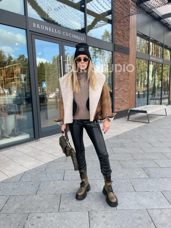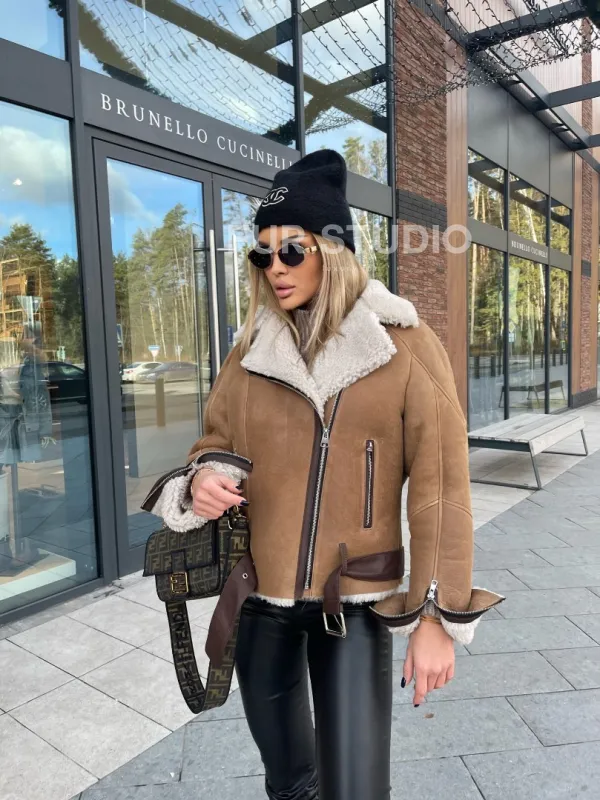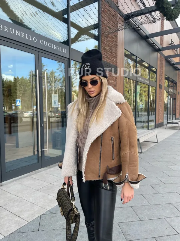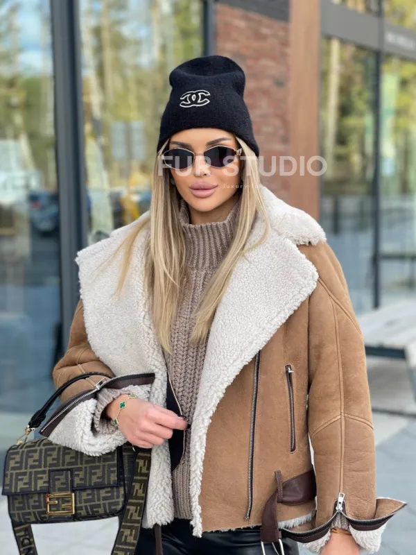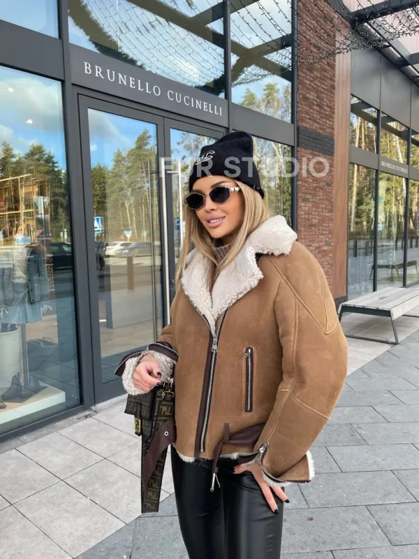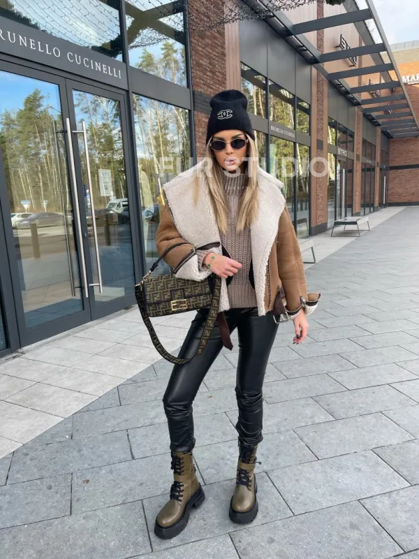 Удобный воротник позаботится о комфортной температуре шеи и подчеркнет ее изгибы. Благородная расцветка выгодно оттенит цвет глаз и волос владелицы. Оригинальный рюкзак и грубая, но стильная обувь будут гармонично сочетаться с образом. Купить дубленку – бомбер со спущенным плечом из натуральной овчины могут молодые девушки, которые хотят выглядеть стильно вне зависимости от времени года.