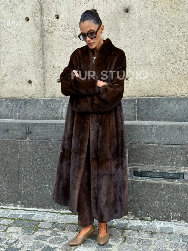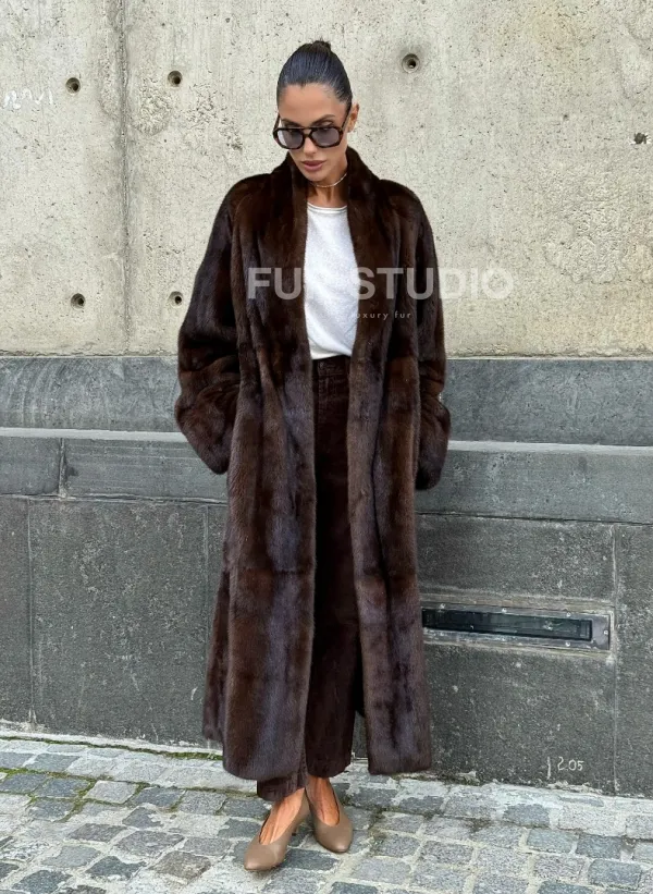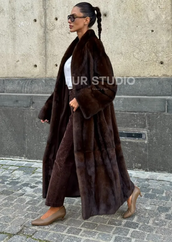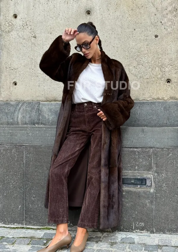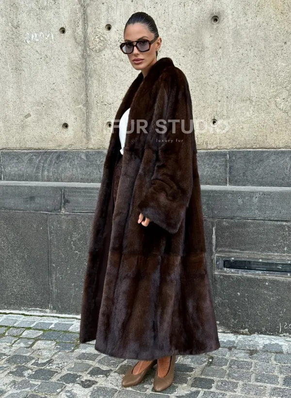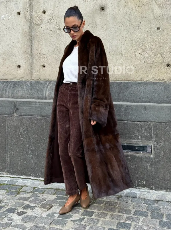 Мех данной шубы аукционная норка, цвет коричневый. Предлагается в размерах от 42 до 48 (инд.пошив от 50 до 64). Длина модели 125-130 см, что выгодно подчеркивает фигуру девушек. Эта модель идеально подойдет для девушек и женщин, предпочитающих роскошные натуральные меха.