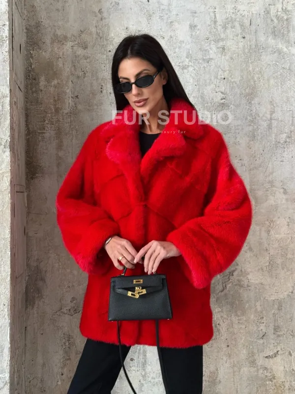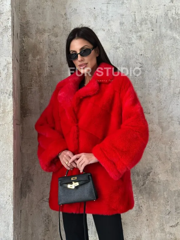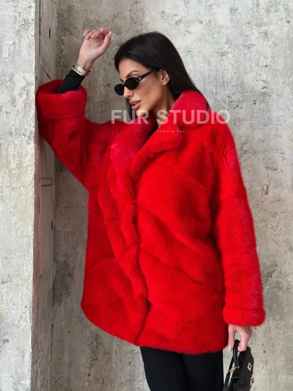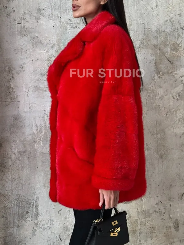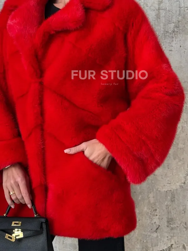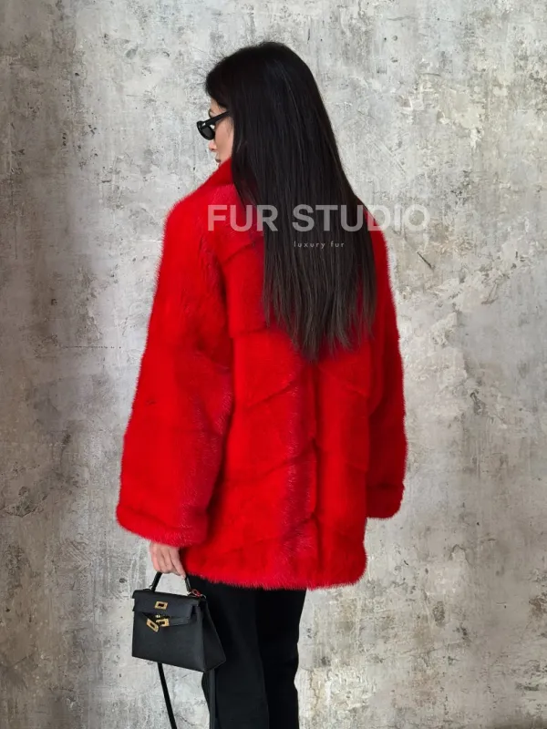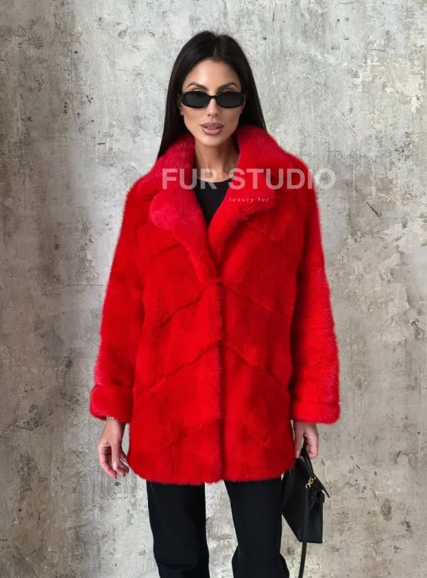 Красный полушубок из натурального меха норки 101350