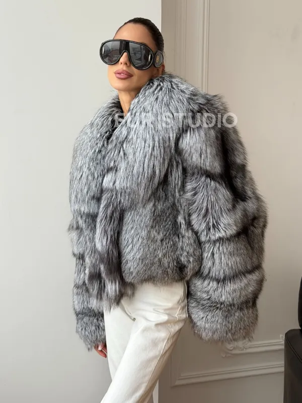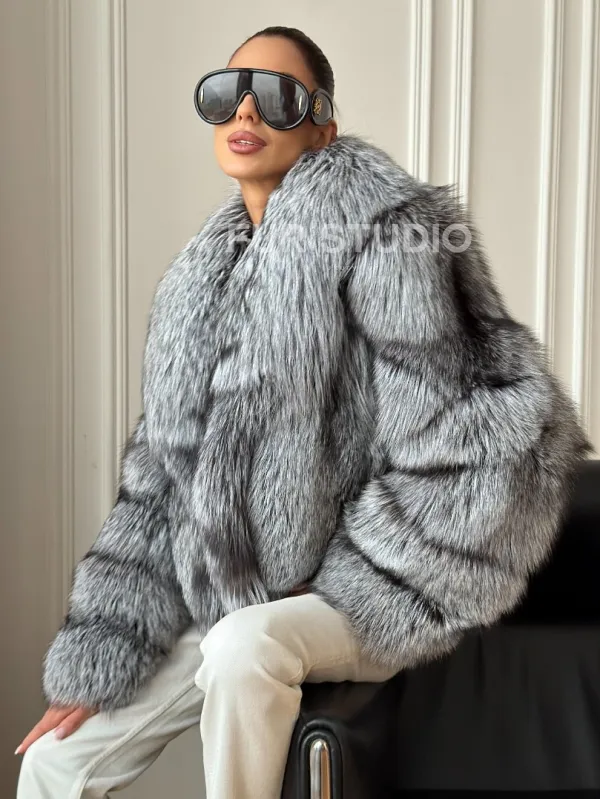 Мех данной шубы лиса, цвет серый. Предлагается в размерах от 42 до 48. Длина модели 50-55 см, что выгодно подчеркивает фигуру девушек. Эта модель идеально подойдет для девушек и женщин, предпочитающих роскошные натуральные меха.