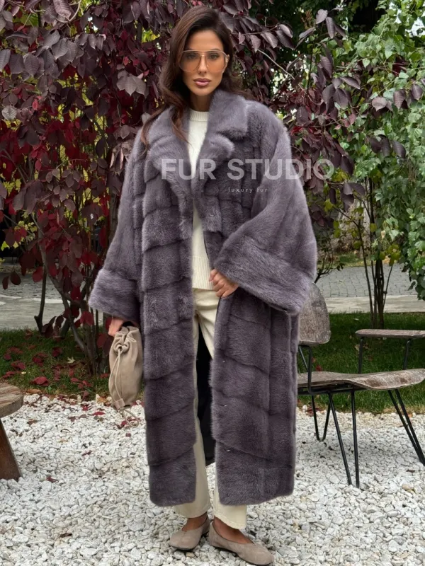 Мех данной шубы аукционная норка , цвет серый. Предлагается в размерах от oversize (42 до 68). Длина модели 120-125 см, что выгодно подчеркивает фигуру девушек. Эта модель идеально подойдет для девушек и женщин, предпочитающих роскошные натуральные меха.