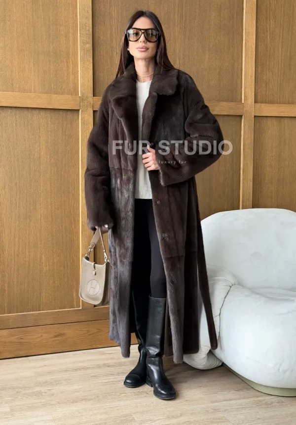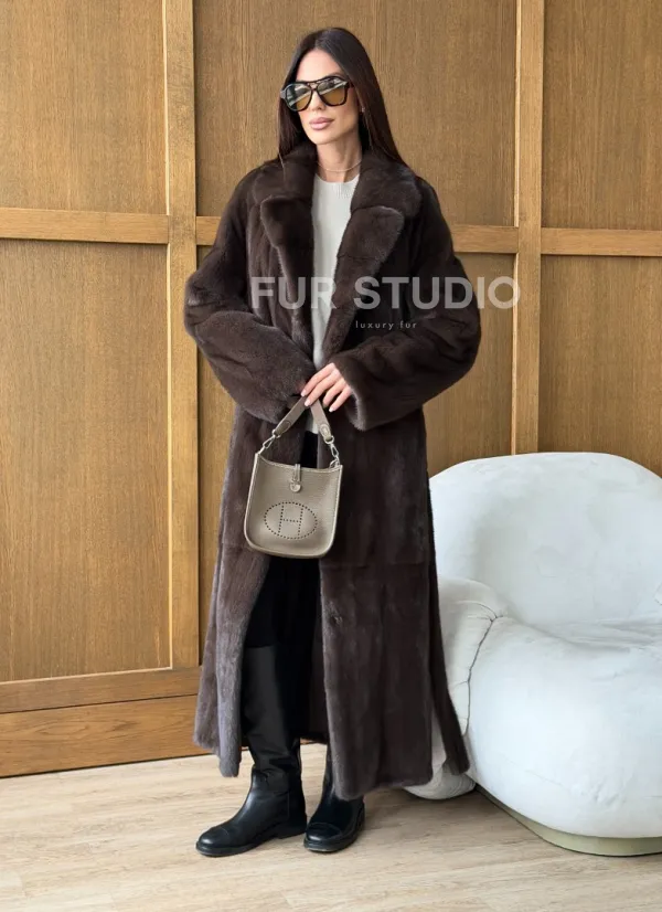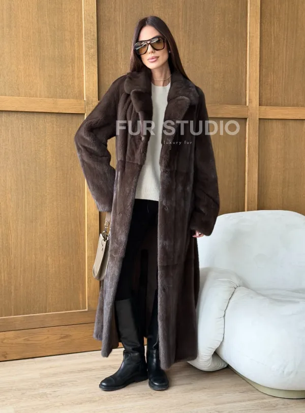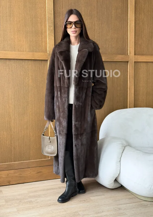 Мех данной шубы аукционная норка, цвет коричневый. Предлагается в размерах от 42 до 52. Длина модели 125-130 см, что выгодно подчеркивает фигуру девушек. Эта модель идеально подойдет для девушек и женщин, предпочитающих роскошные натуральные меха.