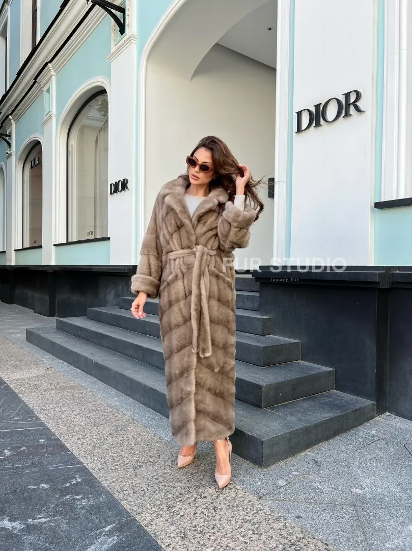 Норковая шуба в цвете пастель – статус и роскошный образ в прохладное время года. Каждая женщина мечтает об изделии из норки. Шуба подчеркивает безукоризненный вкус владелицы. Длина бережно защитит от непогоды в любой мороз. В изделии будет тепло даже в сильные морозы. Оригинальный пояс выделит изящество талии, придаст шарм образу. Удобный воротник согреет шею.