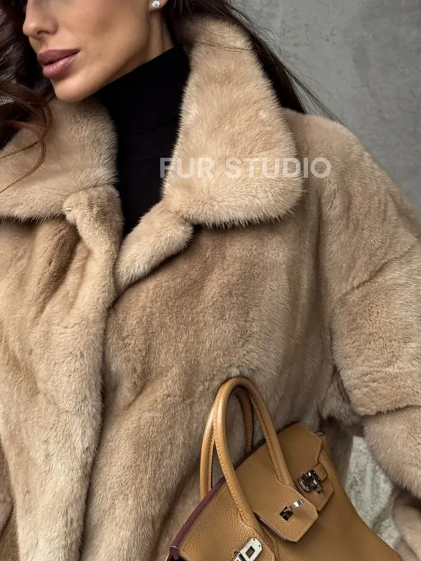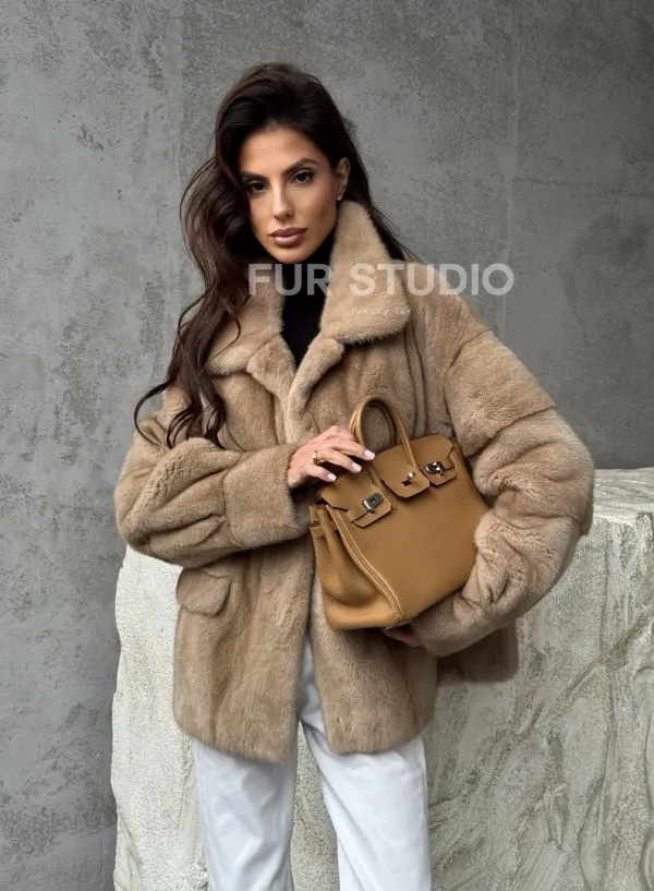 Мех данной шубы аукционная норка, цвет бежевый. Предлагается в размерах от 42 до 50. Длина модели 65-70 см , что выгодно подчеркивает фигуру девушек. Эта модель идеально подойдет для девушек и женщин, предпочитающих роскошные натуральные меха.