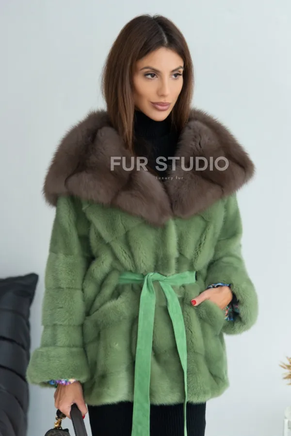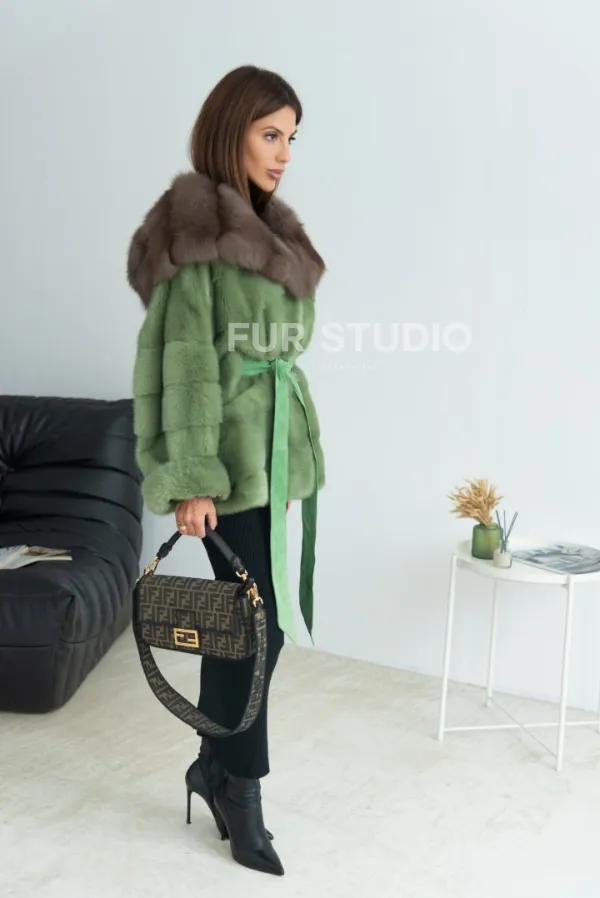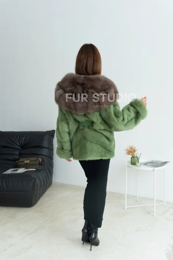 Мех данной шубы аукционная норка, цвет зеленый. Предлагается в размерах от 42 до 50. Длина модели 70-75 см, что выгодно подчеркивает фигуру девушек. Эта модель идеально подойдет для девушек и женщин, предпочитающих роскошные натуральные меха.