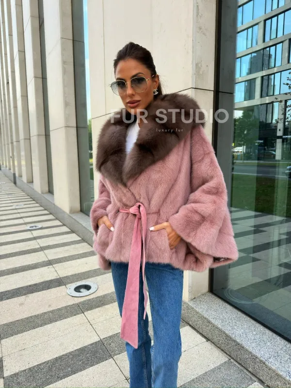 Мех данной шубы аукционная норка, цвет розовый. Предлагается в размерах от 40 до 50. Длина модели 50-55 см, что выгодно подчеркивает фигуру девушек. Эта модель идеально подойдет для девушек и женщин, предпочитающих роскошные натуральные меха.