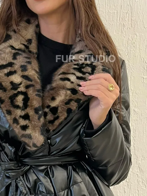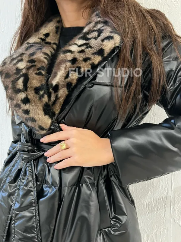 Модель идеальна для дам любого возраста. Длина оптимальна и комфортна для повседневной носки. Необычный пояс выделяет талию и делает силуэт хрупким. Изделие подходит к стилю casual, вечернему наряду. Купить пуховик с мехом норки в анималистическом принте - это отличное соотношение цена/качество.