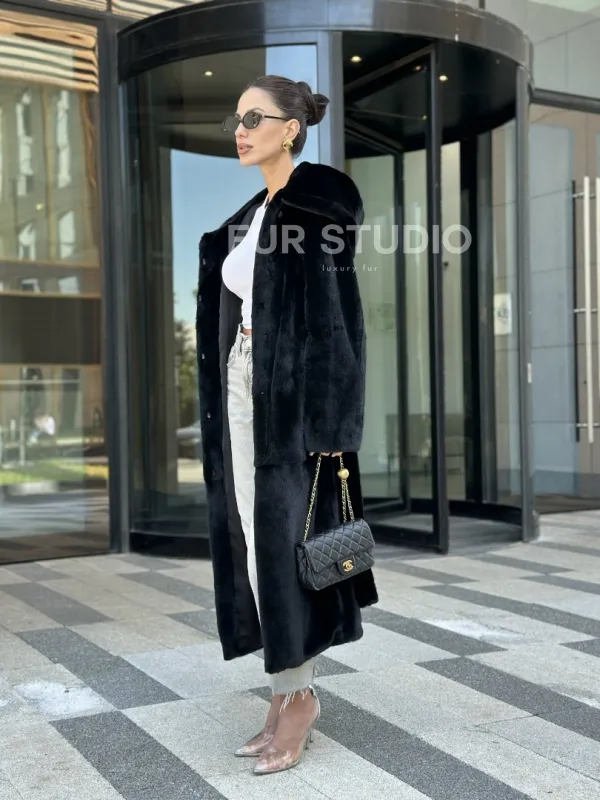 Мех данной шубы норка Blackglama , цвет черный. Предлагается в размерах от 40 до 52. Длина модели 115-120 см, что выгодно подчеркивает фигуру девушек. Эта модель идеально подойдет для девушек и женщин, предпочитающих роскошные натуральные меха.