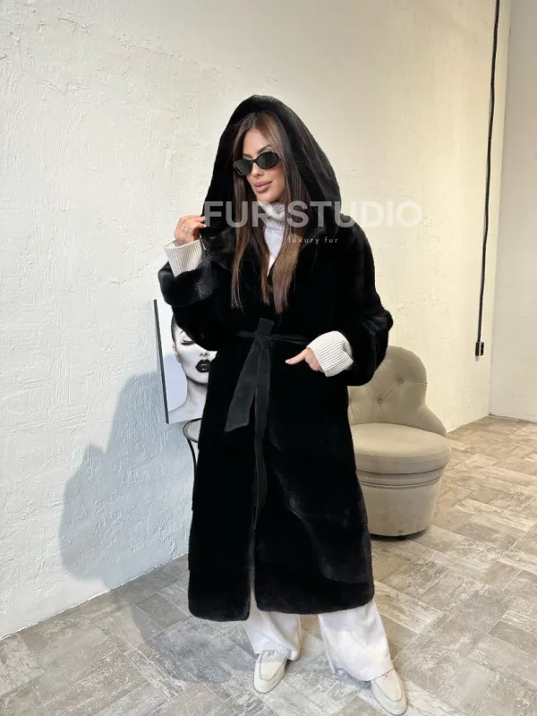 Шуба из канадской плюшевой норки BLACKNAFA с капюшоном создана для стильных дам. Мех канадской норки позаботится о комфортной температуре даже в лютые морозы. Шикарный капюшон сохранит прическу и не даст замерзнуть голове. Длина прикрывает все части тела, а это идеально для любительниц обнаженных ножек в холодное время года. Широкие рукава не сковывают движений, что удобно при вождении машины.