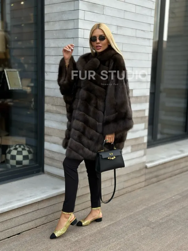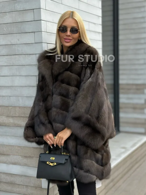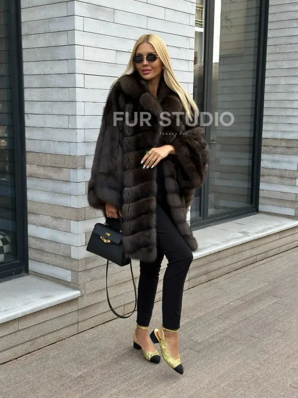 Укороченная шуба из натурального некрашеного меха баргузинского соболя нравится активным и уверенным в себе женщинам. Свободный крой с широкими рукавами не стесняет движений, а благодаря длине чуть выше колена в шубе удобно гулять по городу без страха испортить подол брызгами противогололедного реагента.