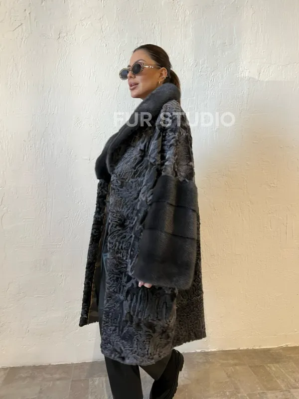 Шуба из меха каракульчи с отделкой из норки 100367
