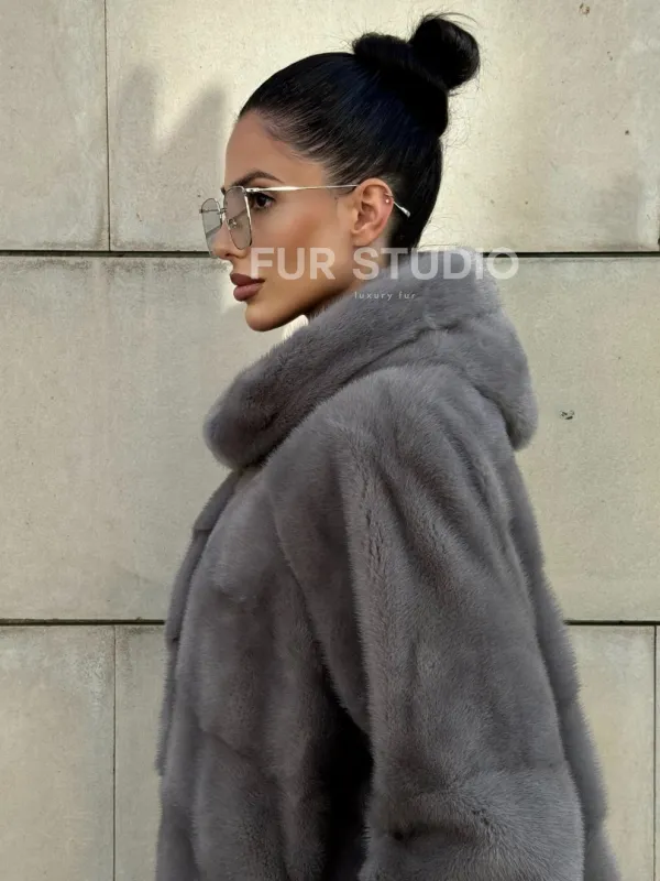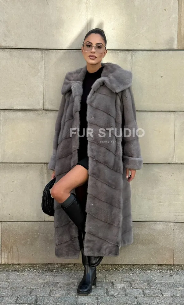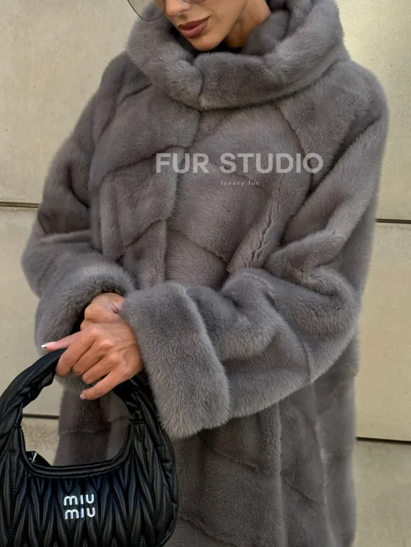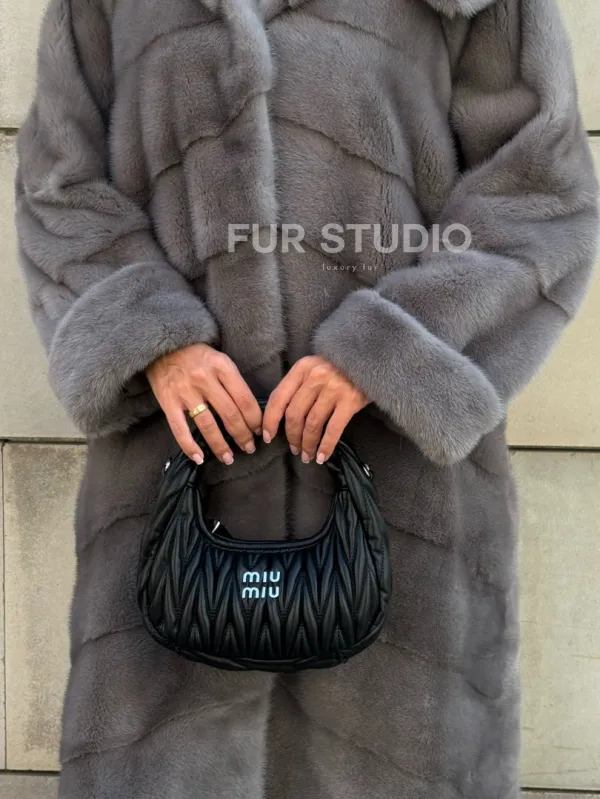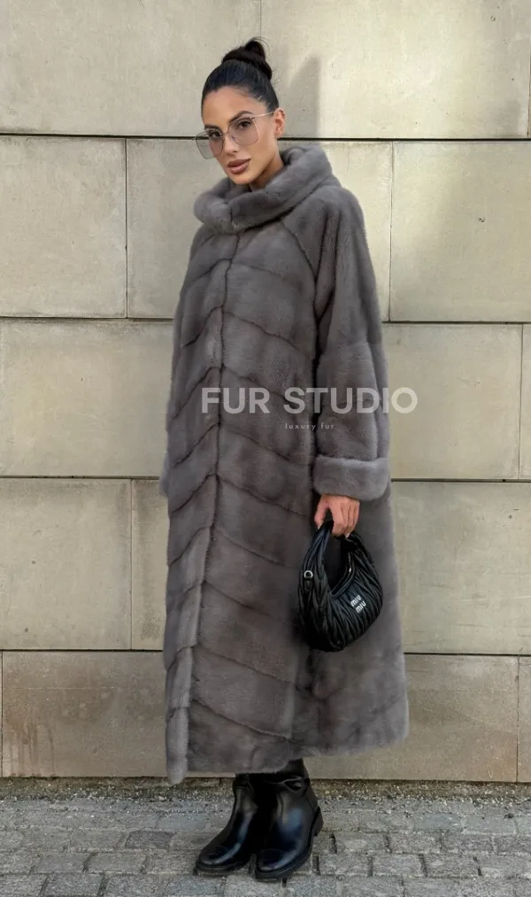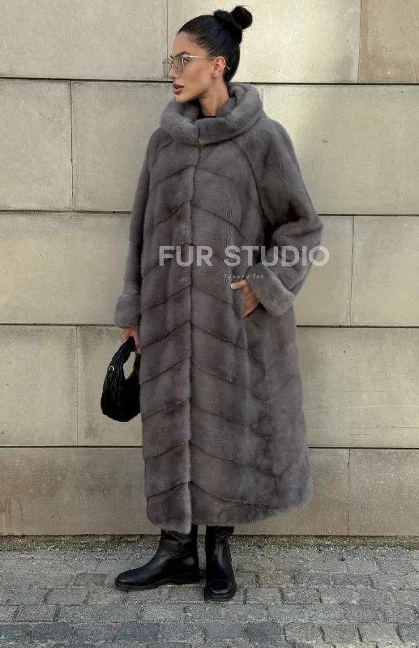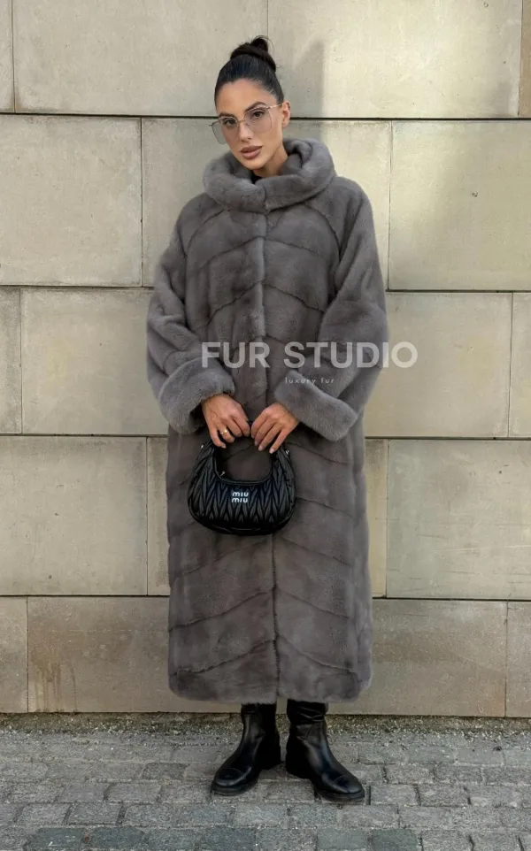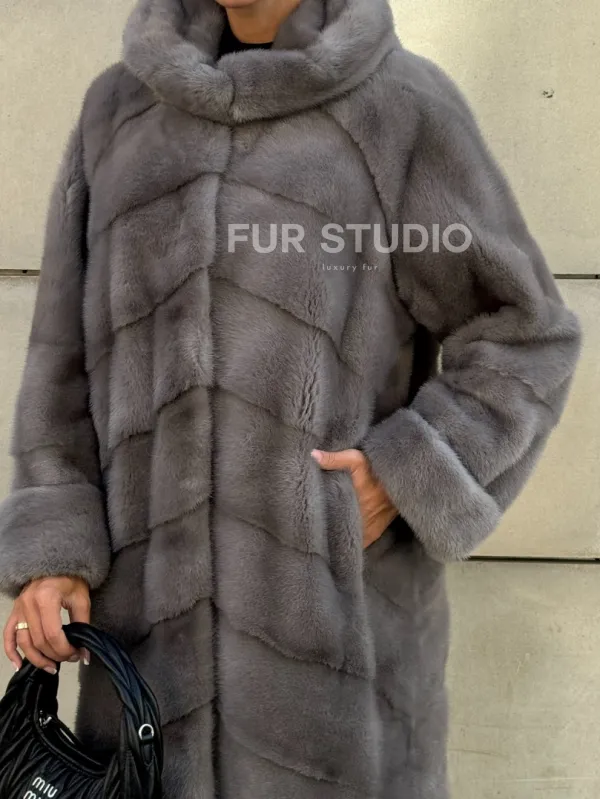 Шуба в диагональной выкладке меха норки, графит грей с капюшоном 101067
