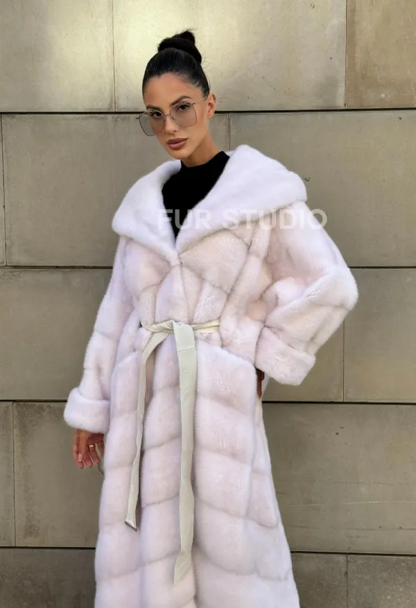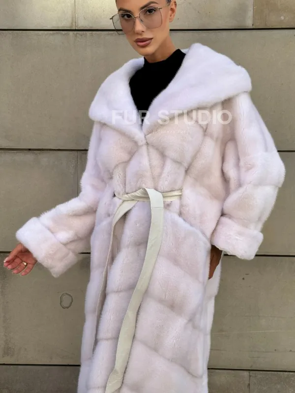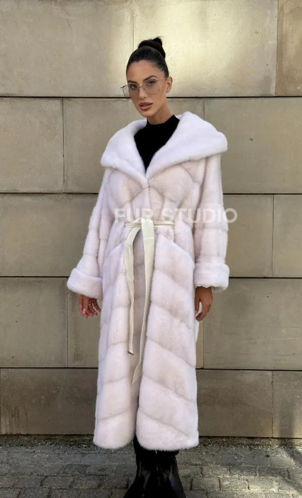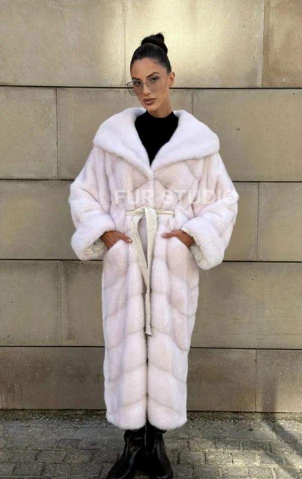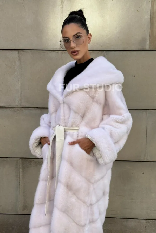 Шуба в диагональной выкладке меха норки White ice с капюшоном 101069