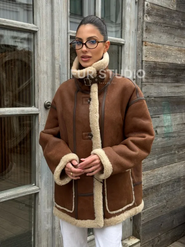 Современная коричневая дубленка из меха кёрли «Casual style» 101306