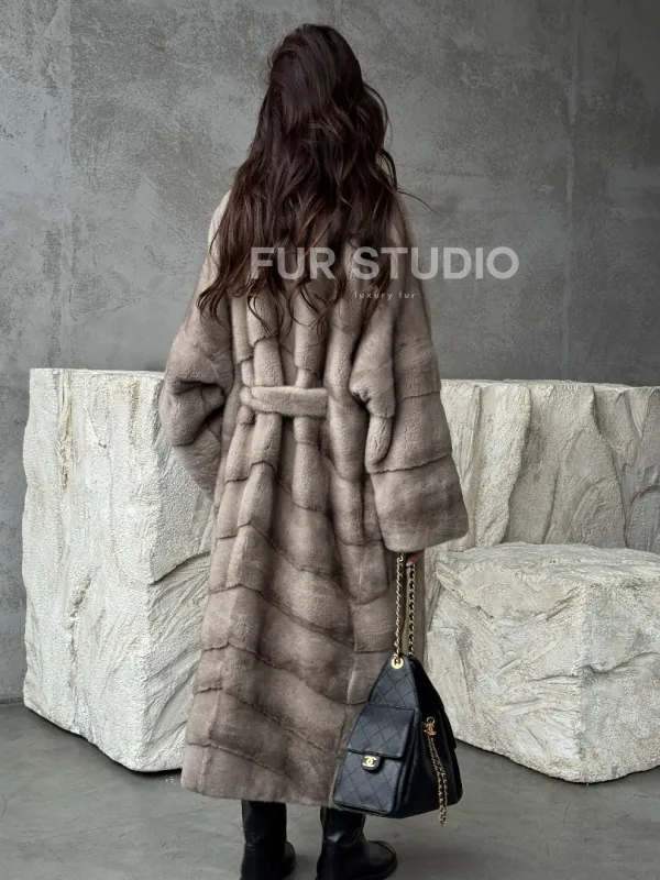 Удлинённая норковая шуба с поясом 102479