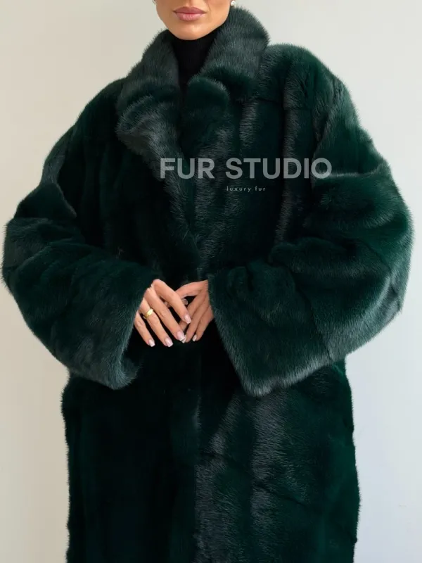 Мех данной шубы аукционная норка, цвет зеленый. Предлагается в размерах от 44 до 56. Длина модели 115-120 см, что выгодно подчеркивает фигуру девушек. Эта модель идеально подойдет для девушек и женщин, предпочитающих роскошные натуральные меха.