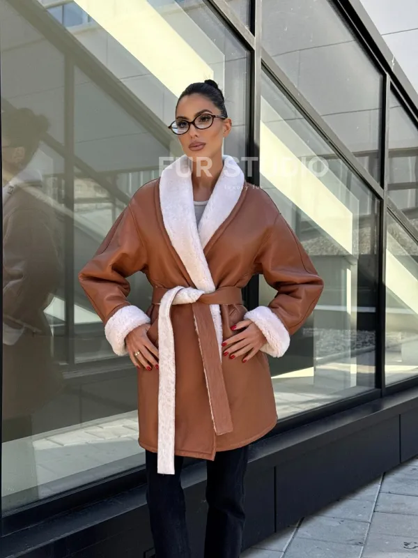 Женская дублёнка на запах с поясом - цвет кэмел 101160